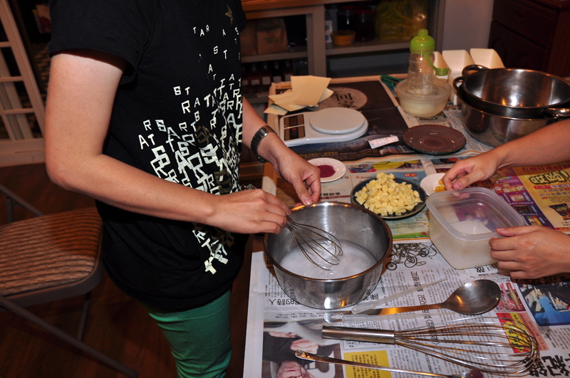 ★達人說:「先用打蛋器連續攪拌十分鐘,雖然手很酸,但中間不可以停止喔!接下來就以攪拌十分鐘休息五分鐘,再攪拌十分鐘,休息五分鐘的方式進行。」