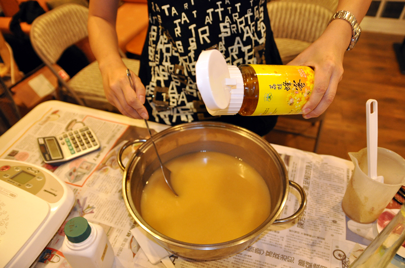 4. 待皂液越來越濃稠,顏色也不再那麼透明,就可以緩緩加入鮮奶和香甜的蜂蜜啦!